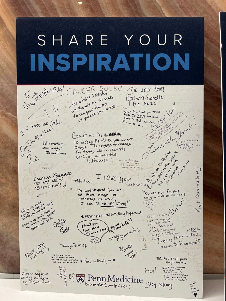 On one walk, I went to the lounge area with a nice view of downtown Philly. In the lounge were two large foam-core board signs. One was about cancer survivors and the other featured inspirational messages written by patients and visitors. The one message that stuck with me was “Your mind is a garden, your thoughts are seeds. You can grow flowers or you can grow weeds.”